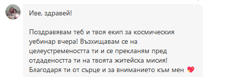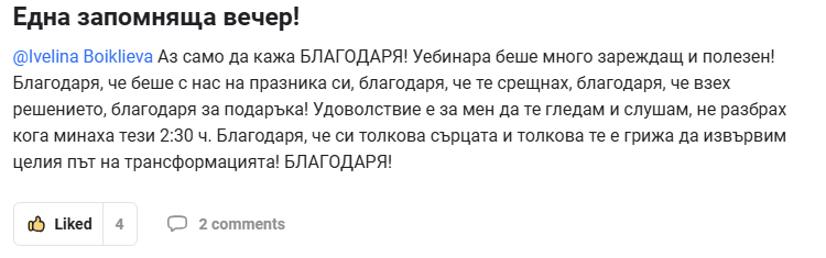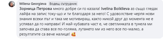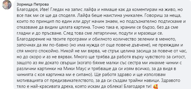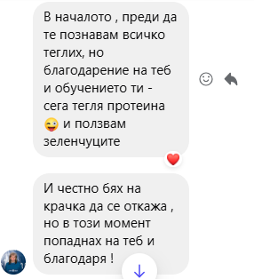 Жени на 30, 40, 50, 60 + , които вече са минали по всички „проверени“ пътища — диети, режими, калории, глад, спорт до припадък… Но този път търсят не временен резултат, а устойчива промяна. Като треньор на жени вярвам, че когато една жена промени живота си, това се отразява и на цялото ѝ семейство и хората около нея. А моята мисия е – 1 000 000 подобрени живота.